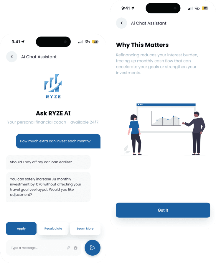 By connecting income, expenses, loans, investments and goals, RYZE turns complex data into simple, practical and realistic recommendations. It doesn’t promise shortcuts it delivers structure, logic and vision for those who want to grow consciously and sustainably.