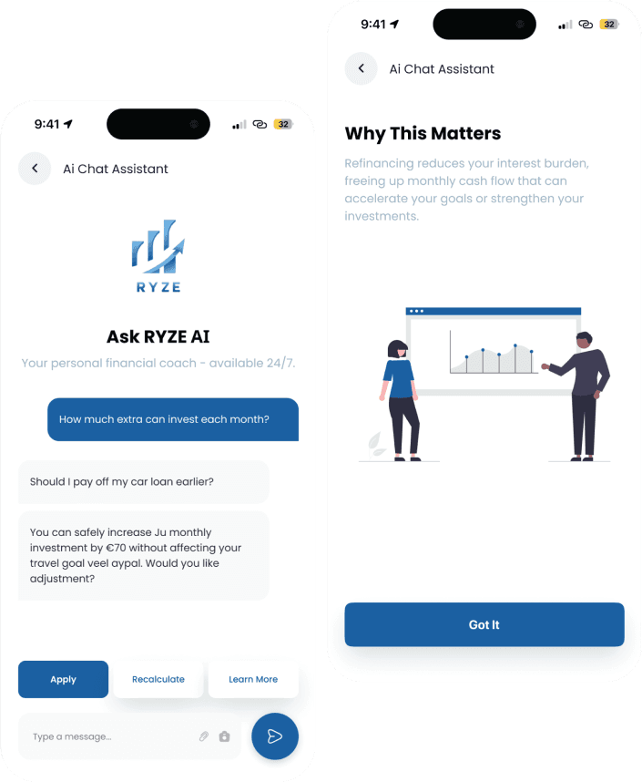By connecting income, expenses, loans, investments and goals, RYZE turns complex data into simple, practical and realistic recommendations. It doesn’t promise shortcuts it delivers structure, logic and vision for those who want to grow consciously and sustainably.